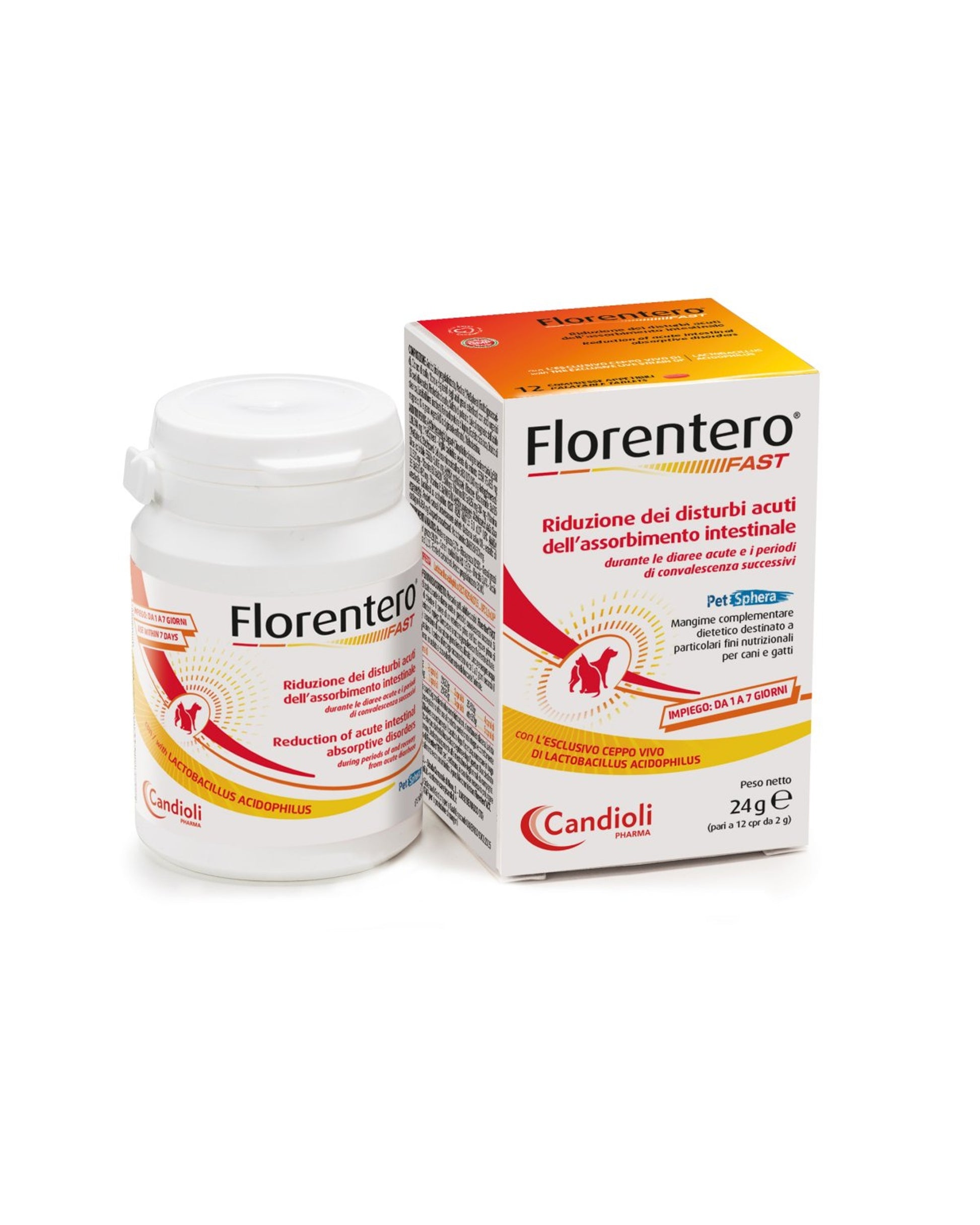 Florentero Fast Compresse è un mangime complementare dietetico per cani e gatti, indicato per la riduzione dei disturbi acuti dell’assorbimento intestinale durante episodi di diarrea e nei periodi di convalescenza successivi. La sua formula favorisce il rapido riequilibrio della flora intestinale e aiuta a migliorare la qualità delle feci.