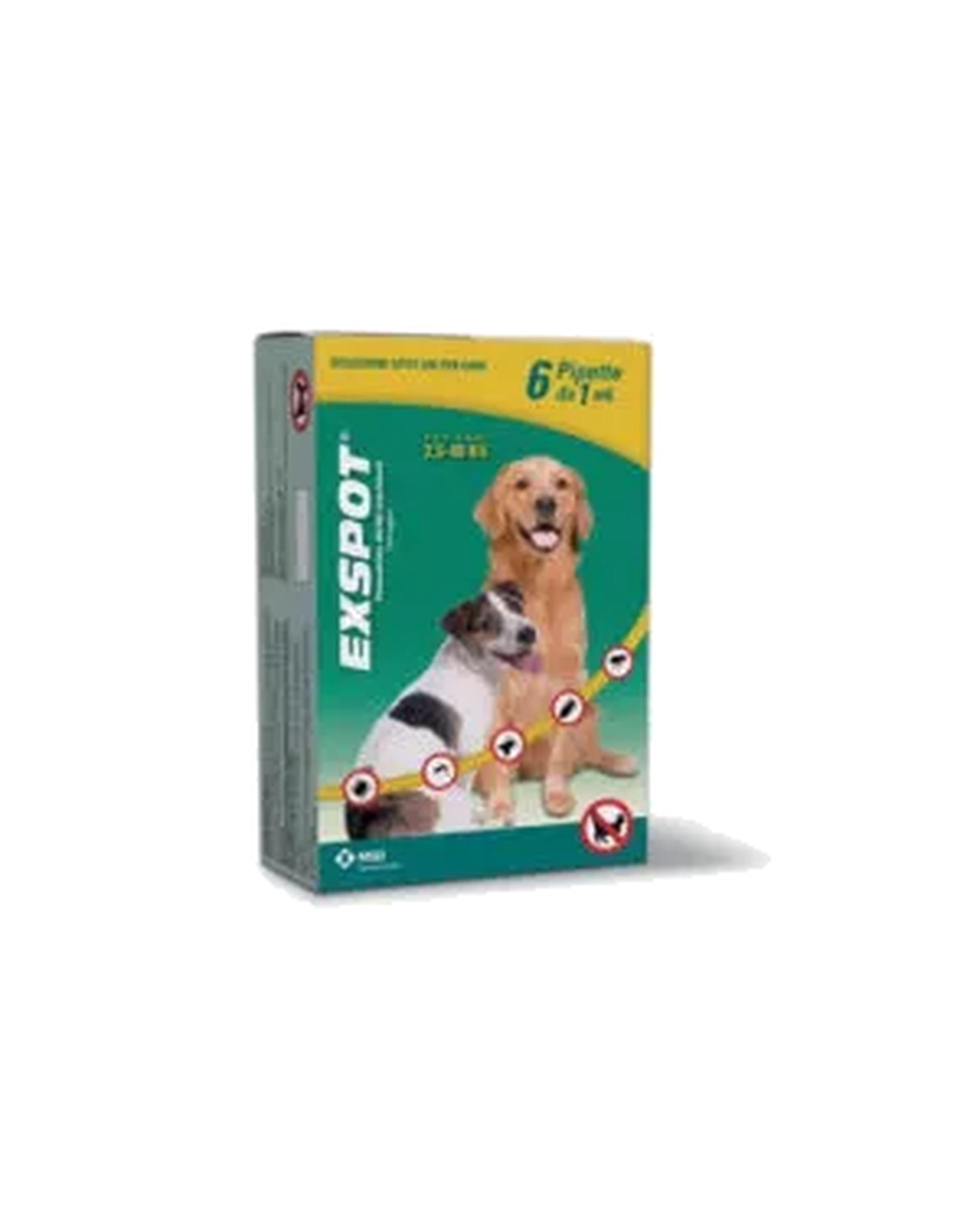 Exspot è uno spot-on antiparassitario per cani, progettato per offrire una protezione completa e duratura contro un'ampia gamma di parassiti esterni. Grazie alla presenza della Permetrina, agisce efficacemente contro pulci, zecche, pidocchi, flebotomi, zanzare e mosche, aiutando a prevenire infestazioni e le patologie a esse collegate.