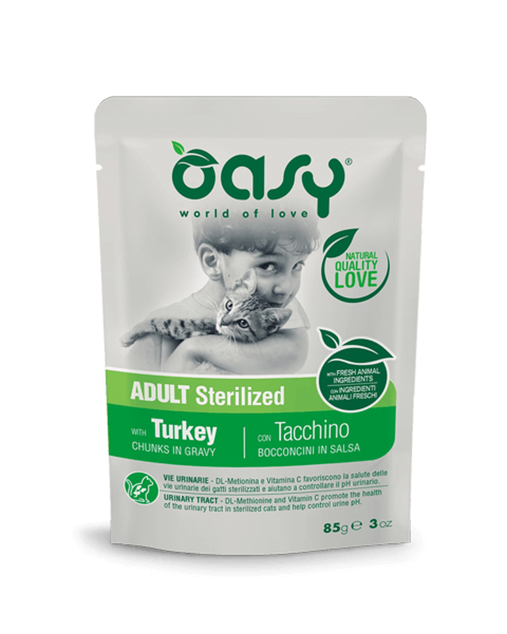 Oasy Bocconcini in Salsa Adult Sterilized con Tacchino è un alimento umido completo ideale per gatti adulti sterilizzati. Preparato con ingredienti animali freschi (minimo 13%) e tacchino (4%), è formulato con DL-Metionina e Vitamina C per supportare la salute delle vie urinarie e controllare il pH urinario. Senza glutine aggiunto, senza aromatizzanti e coloranti artificiali.